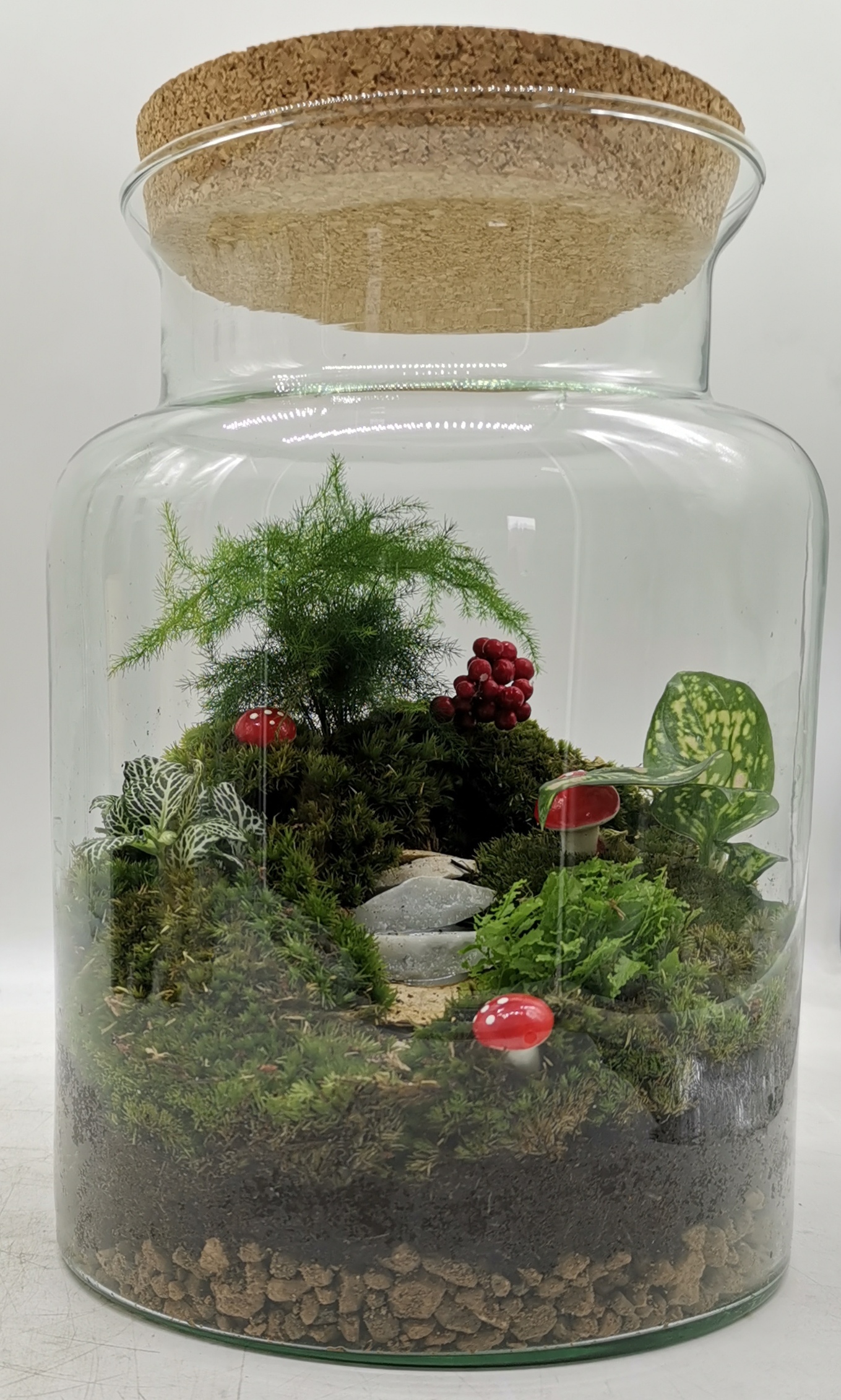 Nei terrarium chiusi (solitamente da un tappo di sughero o a chiusura ermetica), si dispongono strati di argilla espansa o ghiaia grossolana, ghiaia sottile, carbone attivo, terriccio, piante varie e sassolini decorativi.